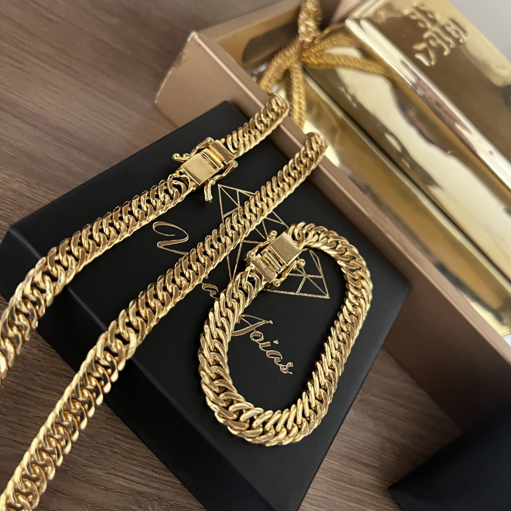 Nos dias de hoje, uma peça 100% ouro deixou de ser atrativo para a maioria das pessoas, por conta do alto valor, furto, insegurança ao sair! Adquirindo uma peça banhada, seu custo é muito menor e a qualidade e cor são idênticas a uma 100% maciça, podendo dar mais tranquilidade para o uso e manter esse acessório que é indispensável em qualquer estilo.